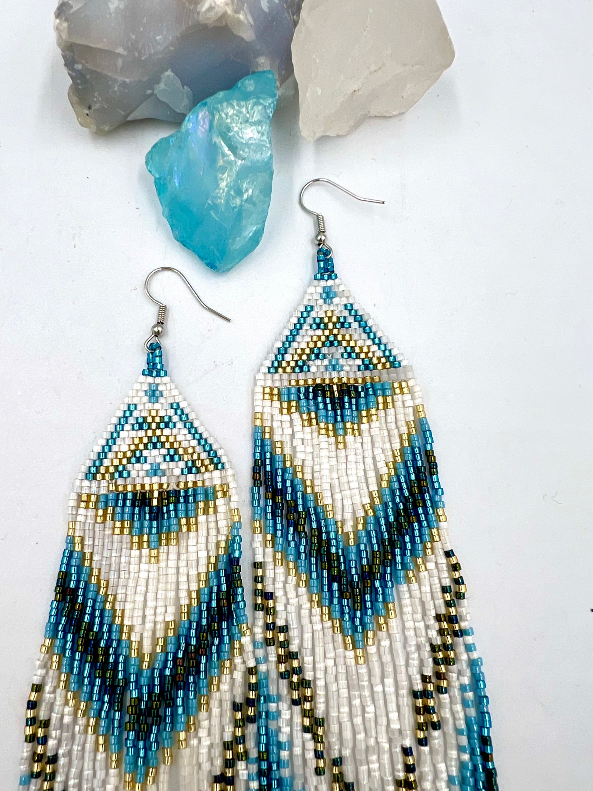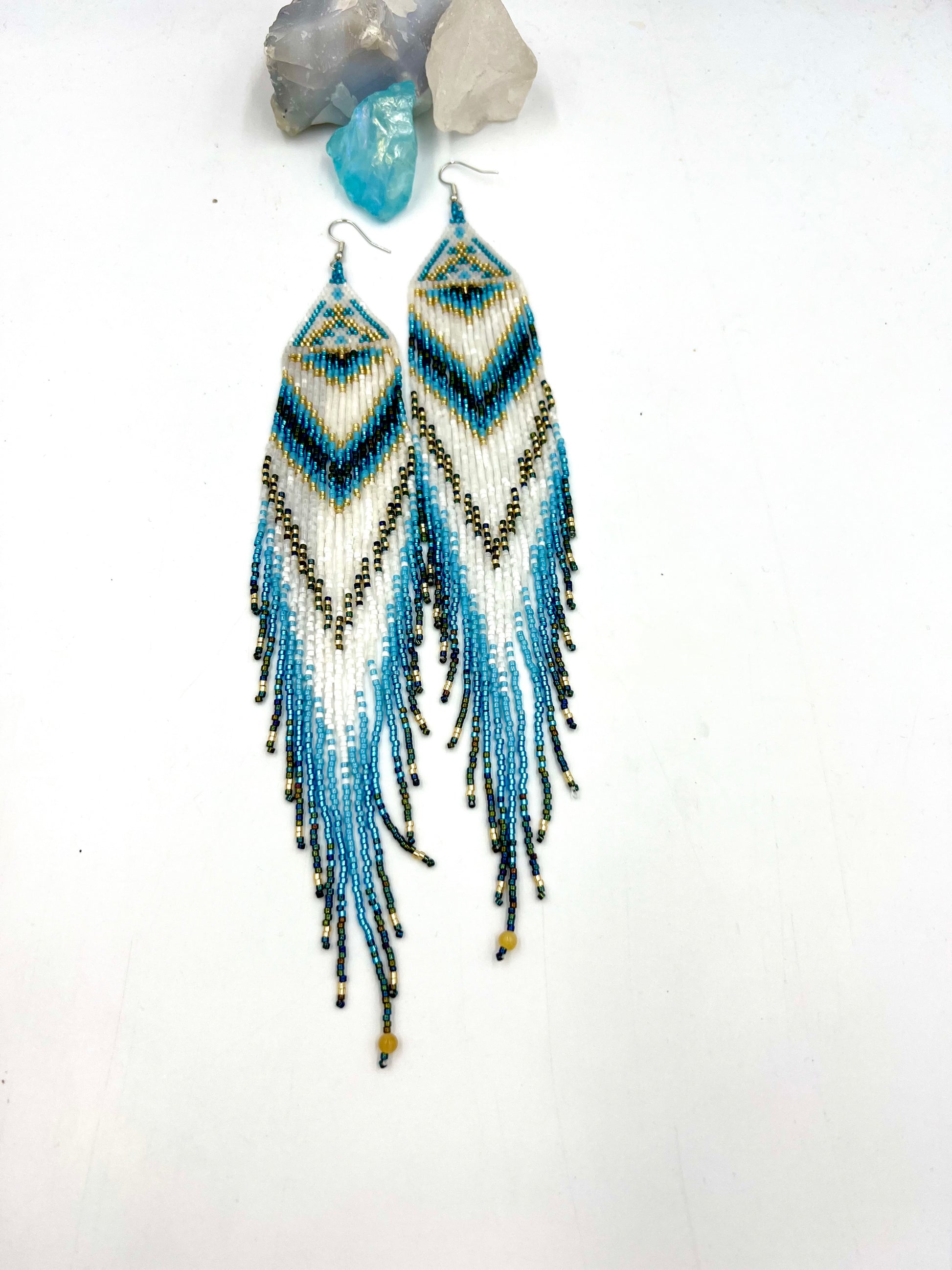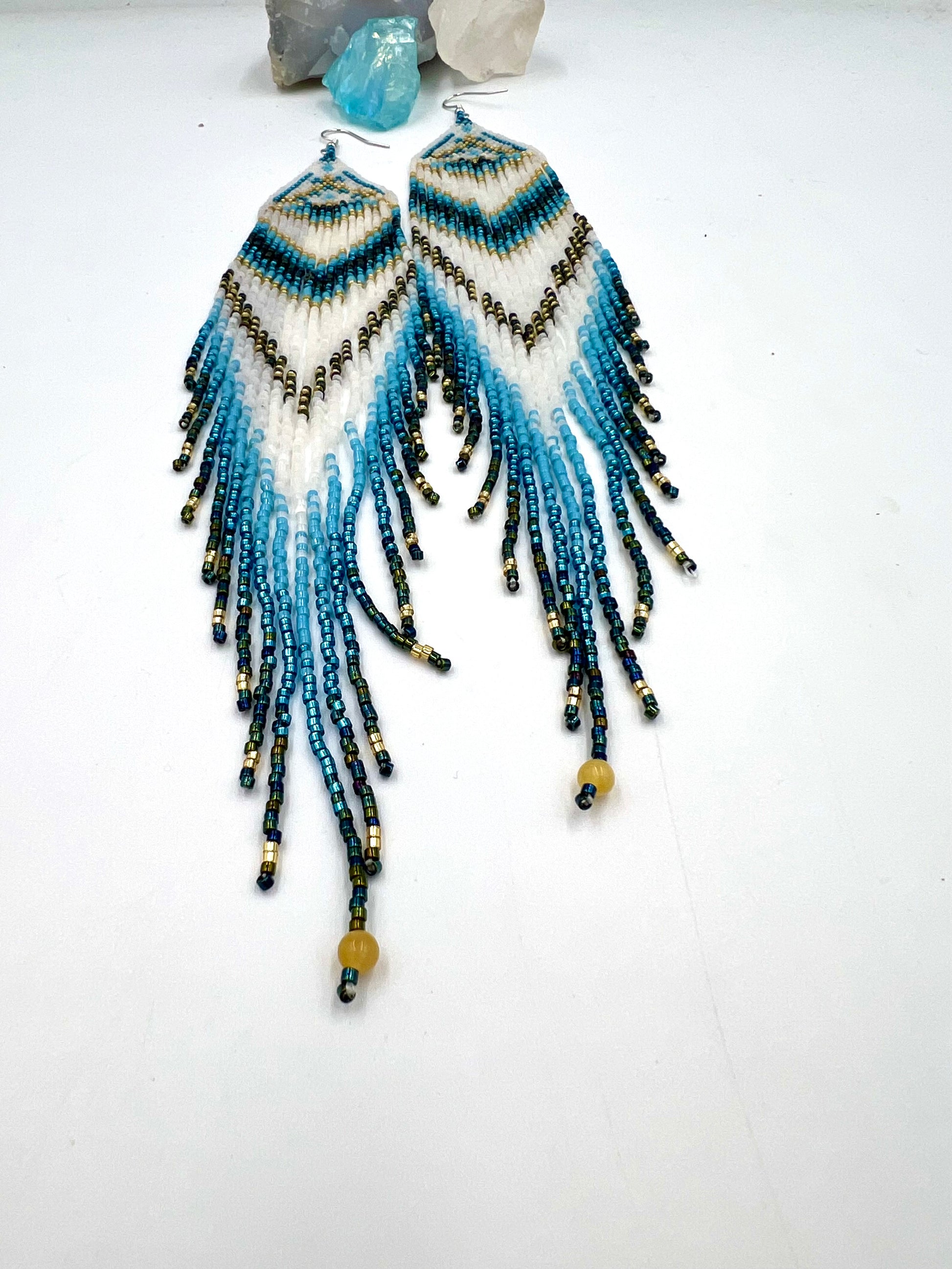 Näiden korvakorujen energia edustaa tervettä, turvallista maskuliinia. Kun olet löytänyt sen sisältäsi, uskallat näyttäytyä raakana, puhtaana ja autenttisena. Kun jotain rikkoontui sydämessäsi, pääsee sielusi valo hoivaamaan säröistäsi sinua tavalla joka on kuin sinulle räätälöity. Älä siis pelkää avautua, rikkoa sydämesi muureja vaan antaudu luottamuksella tuntemattomaan. Silloin pääsee elämänvoima kannattelemaan ja näyttämään sinulle tietä. Kulje omaa tietäsi selittelemättä. Korvisten välkehtivät valkoiset helmet ovat kuin pieniä majakoita matkallasi, sinisen ja kullan vuorottelu kertoo elämän vaiheisuudesta ja honey jade-kivihelmet tuovat iloa, lämpöä ja onnea. Korviksissa on jotain kuninkaallisen arkista. Jokainen hetki on äärimmäisen arvokas, oli tunnetila tai tilanne mikä hyvänsä.