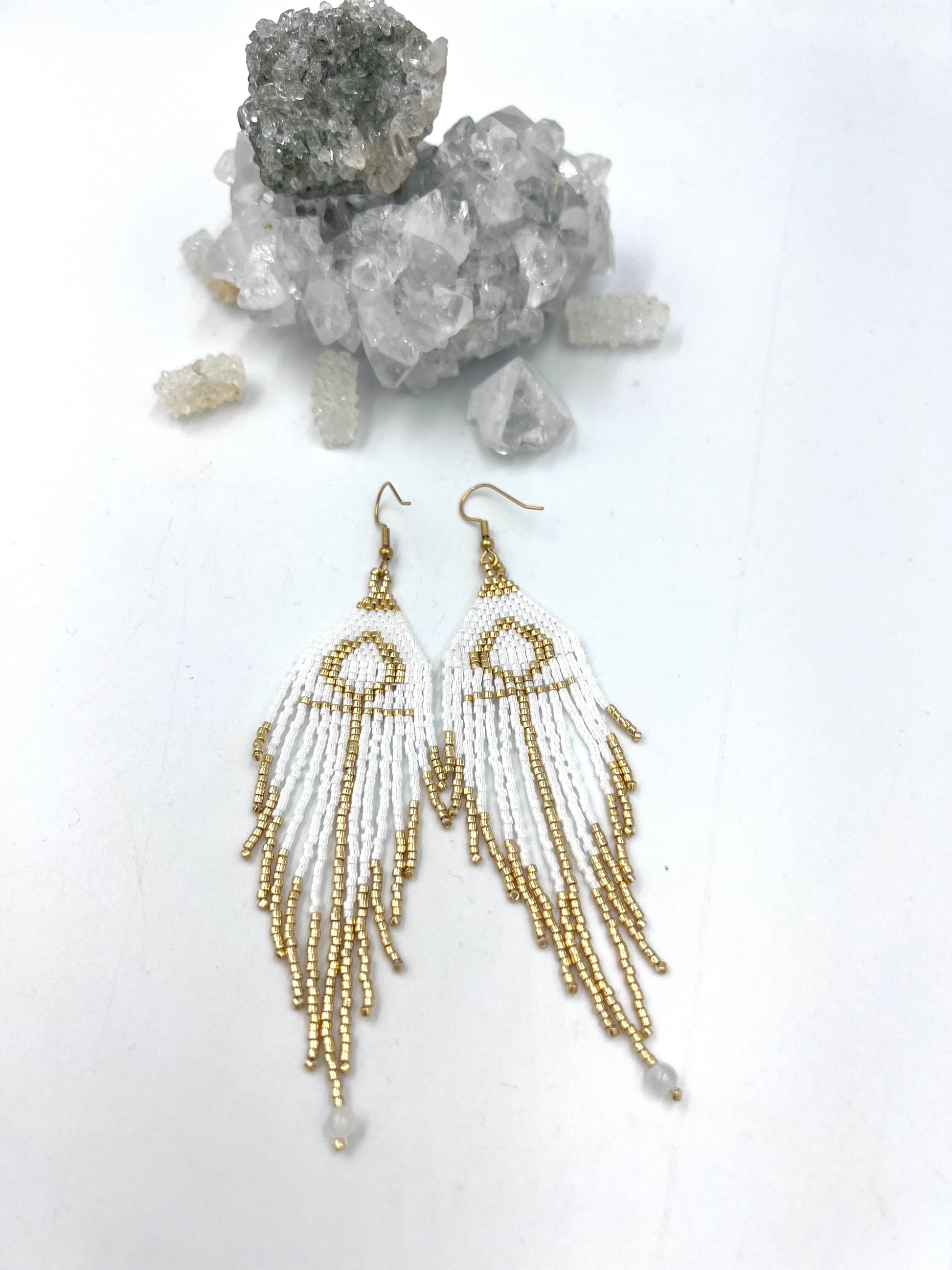 Punottu miyuki delica kullatuista ja valkoisista helmistä