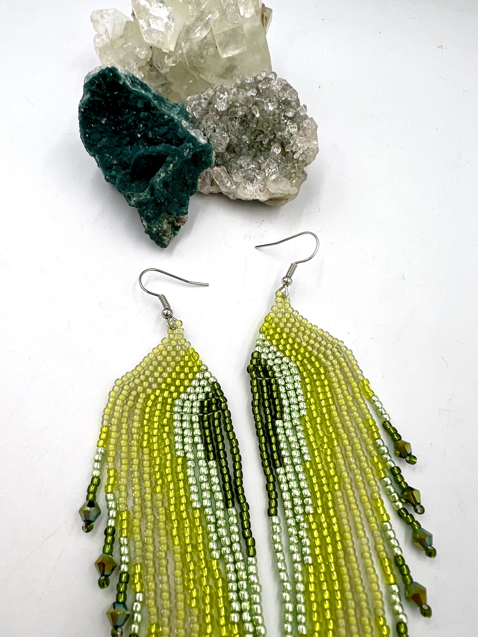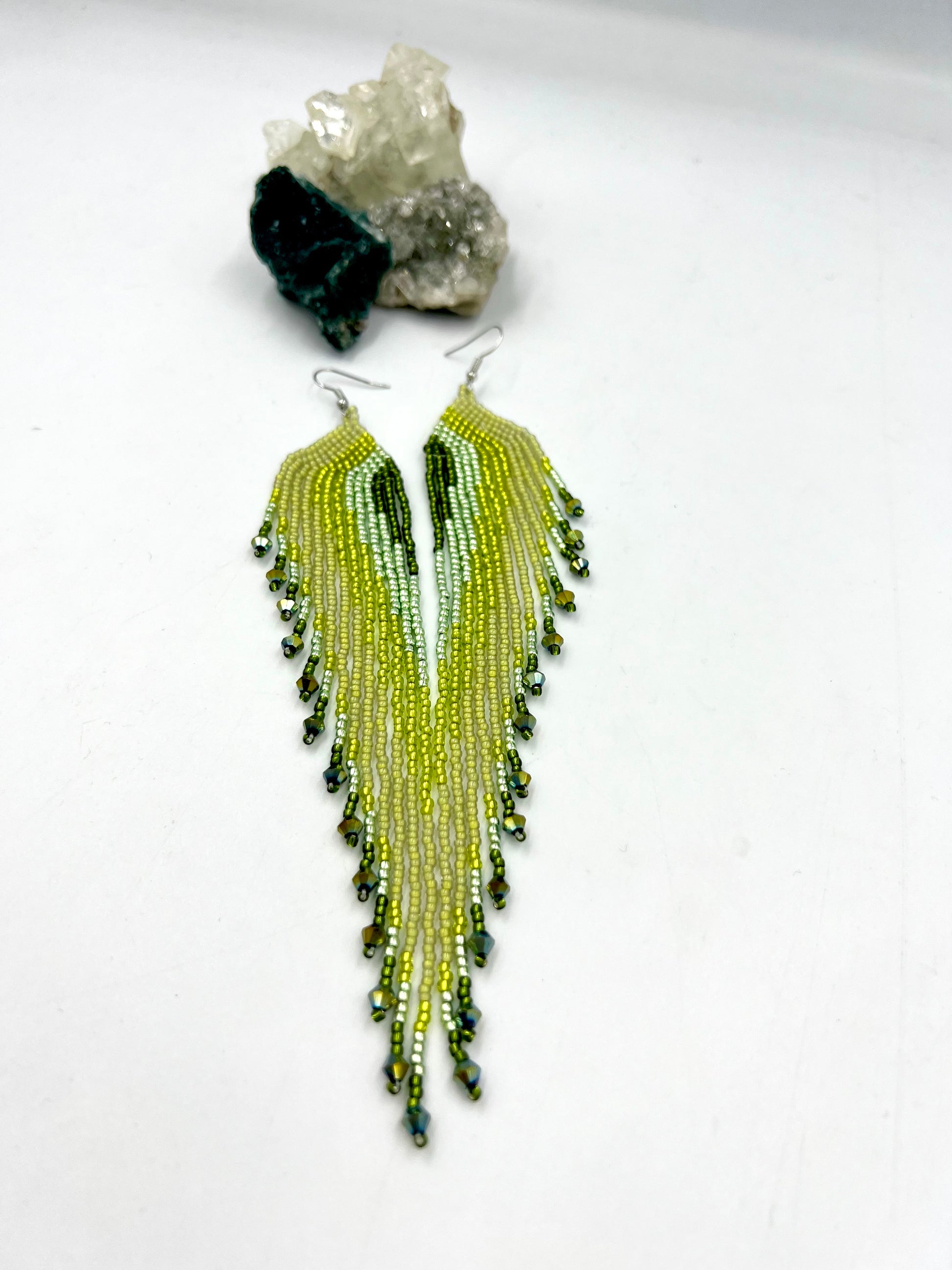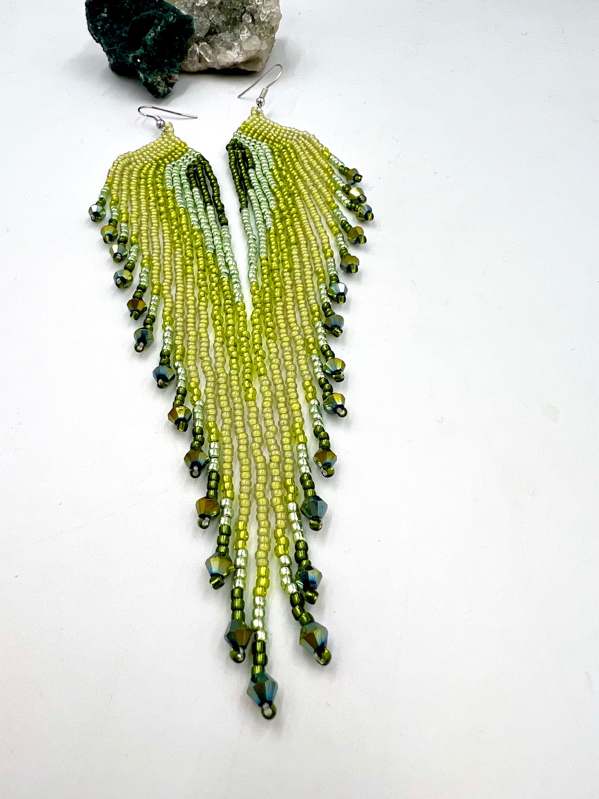 Näiden vihreiden siipi-korvakorujen energia on puhdas kuin metsän henki. Raikasta energiaa, uutta puhtia ja elivoimaa sekä syvää rauhaa ja hiljaisuutta. Vihreät kristallit laskeutuvat rivissä linjaten korun kauniisti välkehtien.