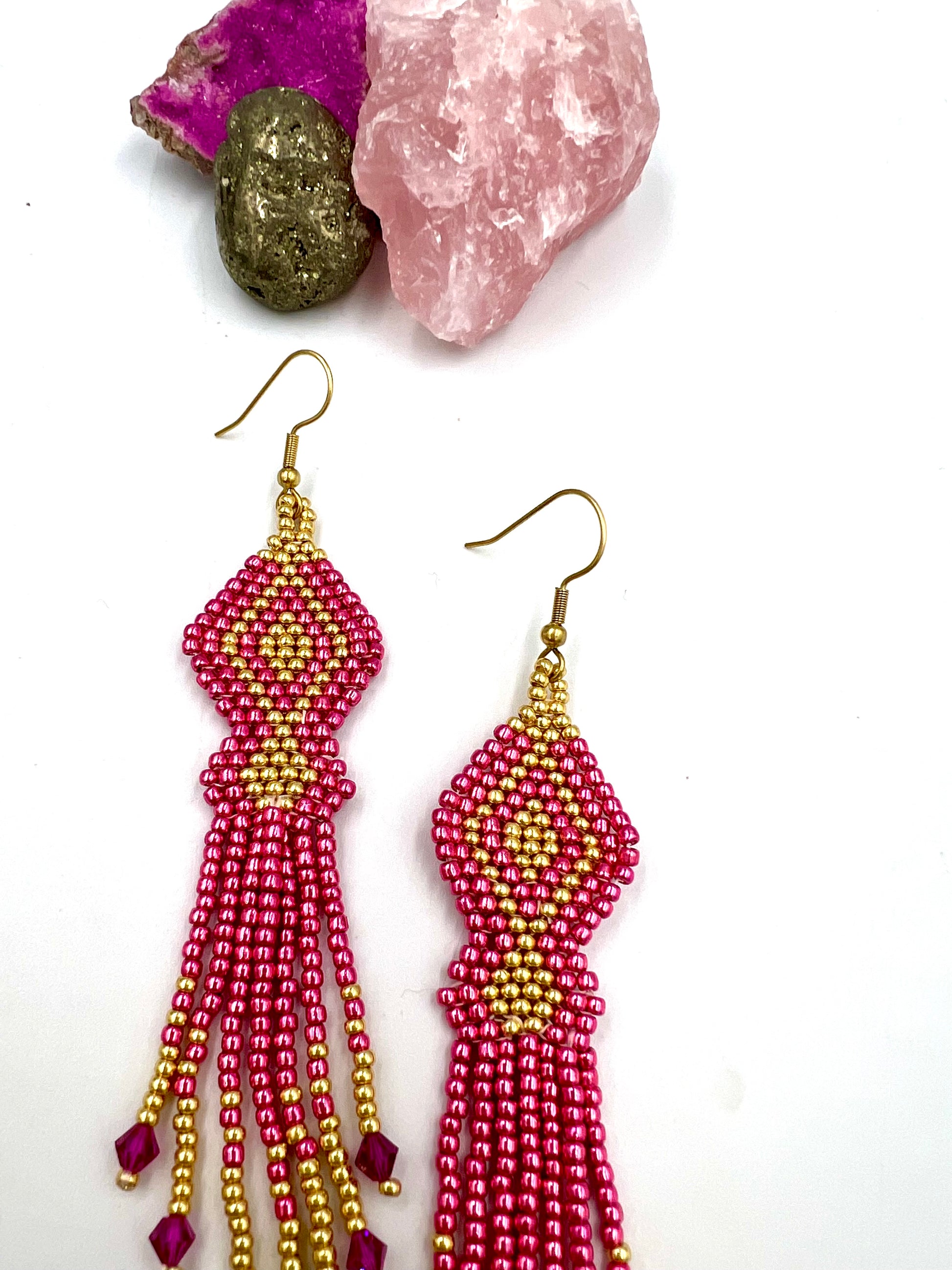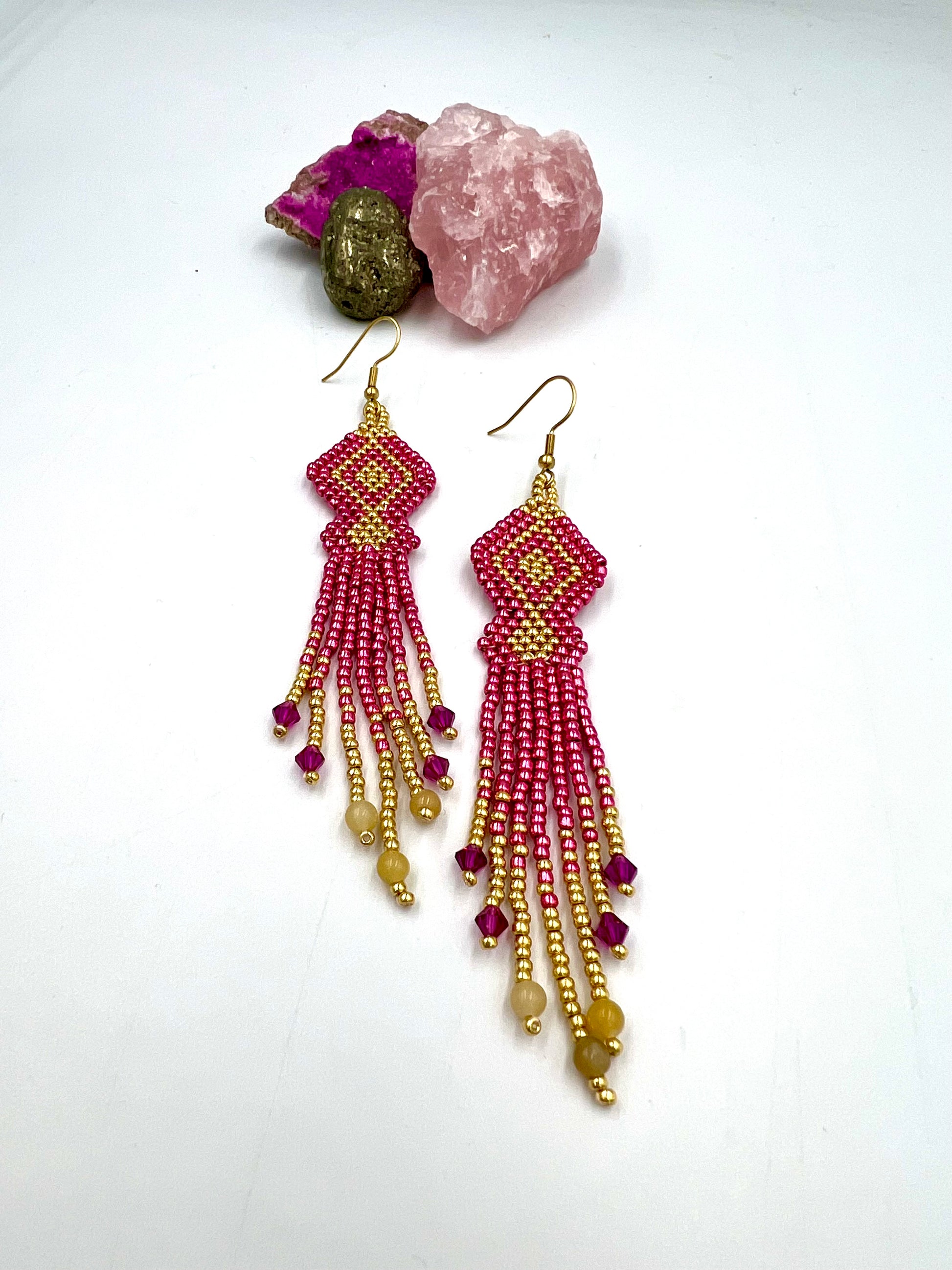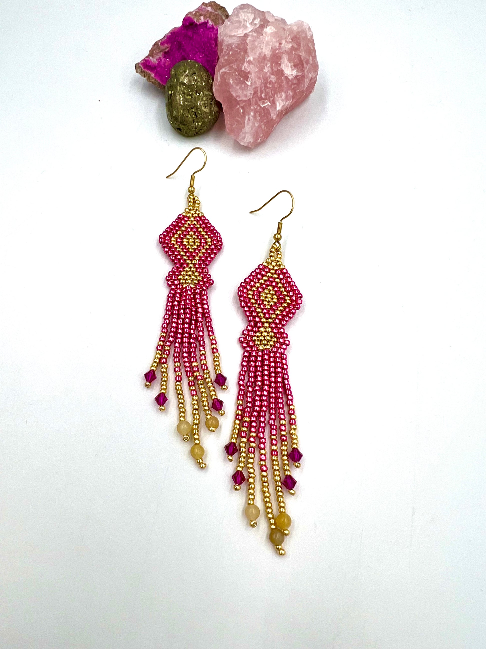 Pinkkejä kristalleja ja hunaja-jadekivihelmiä